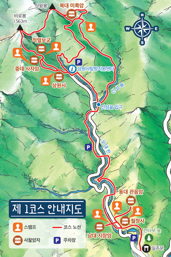 오대산의 ‘오대’에 방점을 찍을 수 있으며, 오대산의 불교문화를 완벽하게 순례하기 위해 가야 할 곳이 북대 미륵암(彌勒庵)입니다. 상원사 입구 큰길에서 북쪽으로 5km 정도 가야 하기에 신중한 계획이 필요합니다. 미륵암은 코끼리 머리처럼 생겼다 해서‘상두암(象頭庵)’이라 불리기도 합니다. 이곳은 석가모니불을 수반으로 한 오백나한(五百羅韓)을 모시는 곳으로 수백 년 동안‘ 나한도량’으로 명맥을 이어왔습니다. 나한전과 나한상 관련한 재밌는 이야기들도 많으니 찾아서 읽어보면 좋을 것 같습니다. 미륵암은 해발 1300m가 넘는 곳인데요. 이른 봄 눈을 뚫고 노란 꽃을 피우는 복수초를 시작으로 우리나라 자생식물의 보고이기도 해서 식물학자들도 많이 찾는다고 합니다.또 이곳의 감로수가 물맛 좋기로 유명하다니 꼭 도전해보세요.
