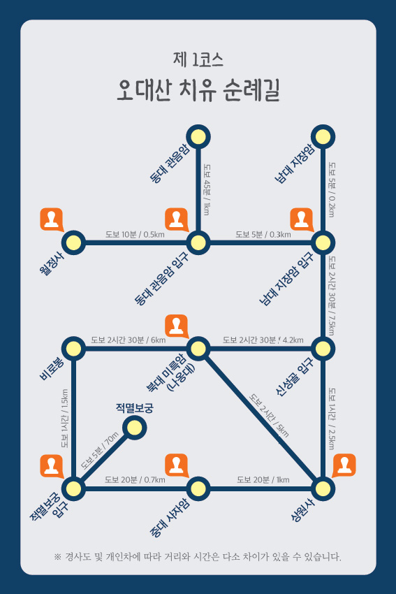 ‘적멸보궁’은 부처님 진신사리를 봉안한 곳으로, 우리나라에는 오대산 월정사, 사자산 법흥사, 태백산 정암사, 영취산 통도사, 설악산 봉정암 다섯 곳이 있습니다. 오대산 적멸보궁은 신라시대 자장율사가 중국 오대산에서 기도하던 중 지혜의 상징인 문수보살을 친견하고 얻은 석가모니 진신사리를 봉안한 불교의 성지입니다. ‘적멸보궁(寂滅寶宮)’은 ‘모든 바깥 경계에 마음의 흔들림이 없고 번뇌가 없는 보배스런 궁전’이라는 뜻으로, 욕심과 성냄, 어리석음이 없으니 괴로울 것이 없는 부처님의 경지를 나타냅니다. 불자라면 꼭 들러봐야겠지만, 불자가 아니어도 꼭 가보아야 할 이유는 많습니다. 오대산 비로봉에서 흘러내린 산맥들이 병풍처럼 감싸 무척 아름답습니다. 암행어사 박문수는 ‘천하의 명당’이라 감탄했다죠. 선재길의 마지막 종착점에서 불교성지 오대산을 오롯이 만나보세요